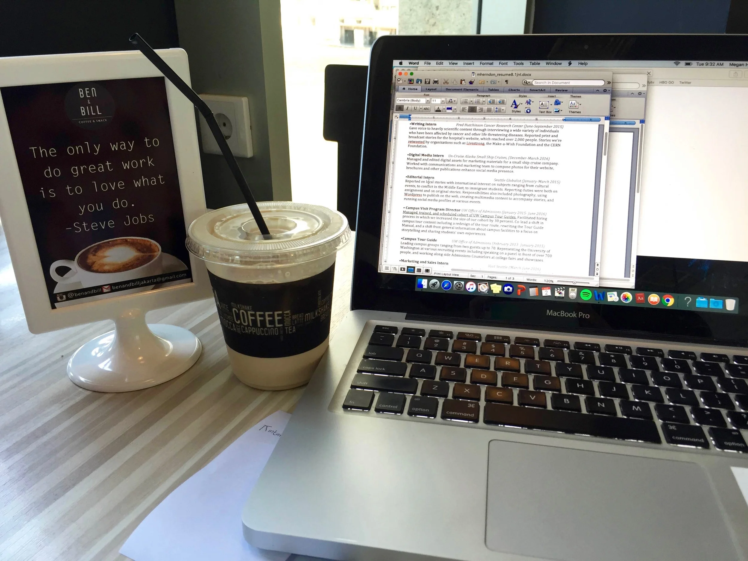 I wish I had a solution. I spent my classes in the business school, classes I took as a backup in case journalism didn't workout, thinking about how we could support news in our time. There definitely are some millennial publications like Buzzfeed and The Skimm who seem to have it figured out. I think means there is a way into journalism for my generation, its just not a clear path, and I could really use some clarity right about now. I’ll leave you with a photo of this somewhat-tacky-but-relevant Steve Jobs quote on the menu at the café I’m working at, in hopes I'll figure it out.